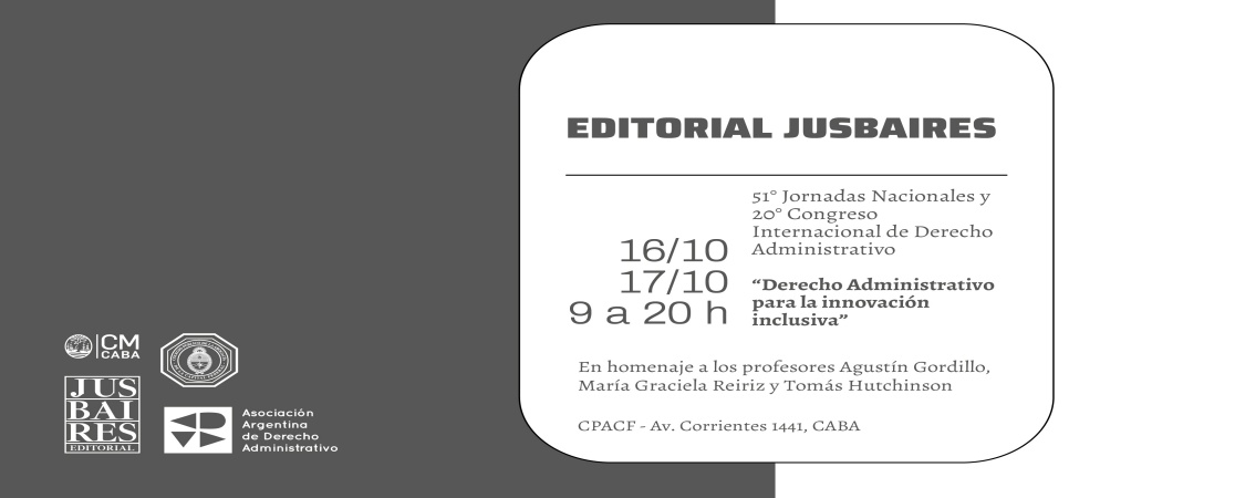 Desde la Editorial Jusbaires tenemos el agrado de invitarlos/las a participar del inicio de la 51° Jornadas Nacionales y 20° Congreso Internacional de Derecho Administrativo, La misma se llevara a cabo este jueves 16 de octubre de 9:00 a 16:00 hs. y continuara el día viernes 17 de octubre de 9:00 a 20:00 hs. en Av. Corrientes 1441 (CPACF).