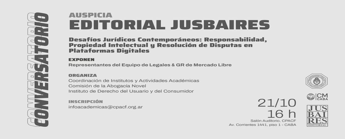 Desde la Editorial Jusbaires tenemos el agrado de invitarlos/las a formar parte del conversatorio “Desafíos Jurídicos Contemporáneos: Responsabilidad, Propiedad Intelectual y Resolución de Disputas en Plataformas Digitales” este 21 de octubre a las 16:00 hs. en el Salón Auditorio del Colegio Público de la Abogacía de la Capital Federal (Av. Corrientes 1441, 1.º piso, CABA).