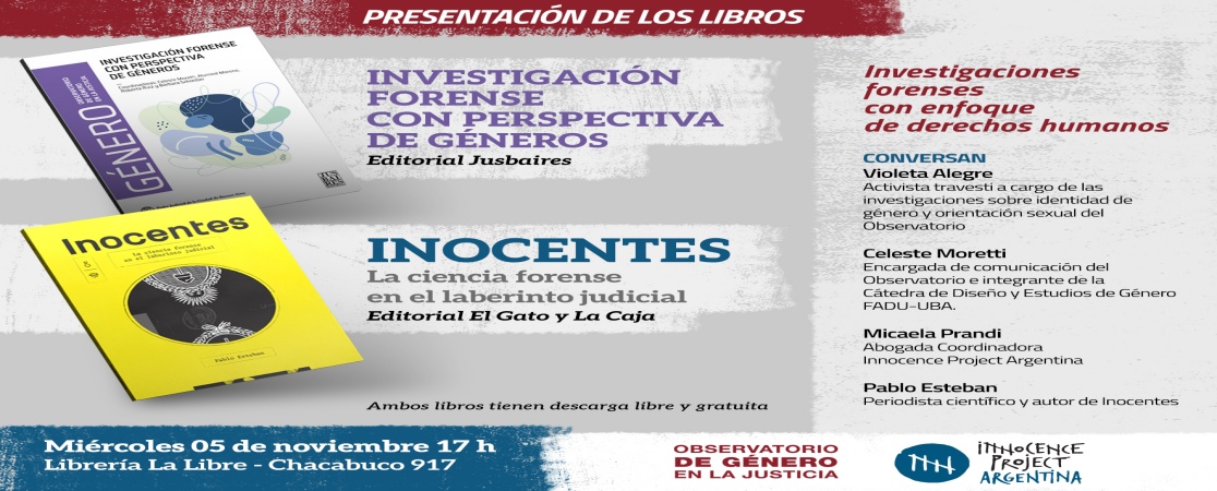 Nos complace invitarles a la conversación “Investigaciones forenses con enfoque de derechos humanos” donde se presentarán los libros “Investigación forense con perspectiva de géneros” publicado por la Editorial Jusbaires y compilado desde el Observatorio de Género por Celeste Moretti, Aluminé Moreno, Roberta Ruiz y Bárbara Schreiber y el libro “Inocentes. La ciencia forense en el laberinto judicial” publicado por la Editorial El Gato y La Caja y escrito por Pablo Esteban.