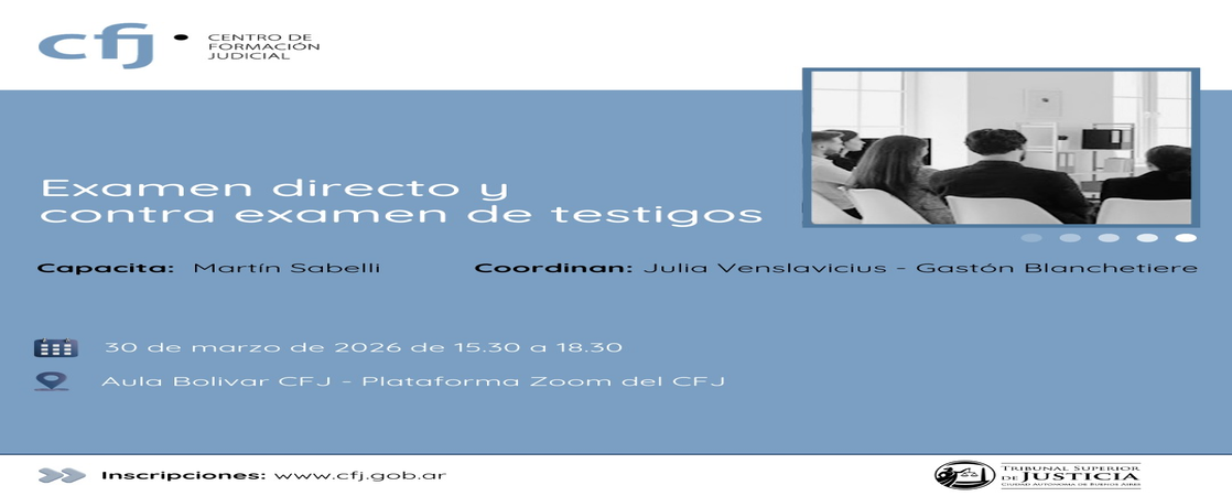 Desde la Dirección de Juicio por Jurados tenemos el agrado de invitarlos a la charla inaugural del ciclo de capacitaciones que hemos emprendido desde que estamos en funcionamiento, donde tenemos el honor de contar con la presencia del Dr. Martín Sabelli como primer capacitador de esta primera jornada titulada: “Examen directo y contra examen de testigos en el juicio por jurados”, a desarrollarse el 30 de marzo de 2026 a las 15 horas, en las aulas del Centro de Formación Judicial.