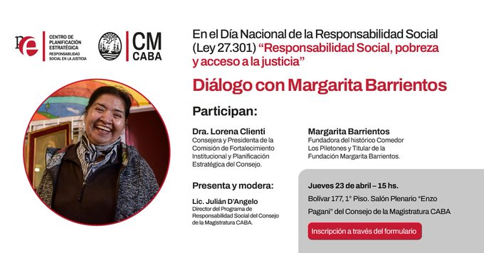 Te invitamos a un diálogo con Margarita Barrientos sobre pobreza, inclusión y acceso a la justicia. 23/4 – 15 hs Bolívar 177 (CABA)
