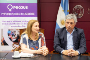 El Programa “Protagonistas de Justicia” busca fortalecer y transformar a mujeres referentes territoriales en amplificadoras de justicia en sus barrios, favoreciendo el desarrollo de habilidades socio emocionales y técnicas jurídicas con enfoque de Derechos Humanos y perspectiva de género. Para ello se disponen una serie de encuentros y capacitaciones a través de especialistas sobre la normativa existente y los circuitos de derivación, estimulando la participación y generando debates sobre vulneración de derechos. Este dispositivo busca consolidarlas como vehículos para el acercamiento de los servicios de justicia a la gente volviéndose un verdadero y necesario puente con la ciudadanía.