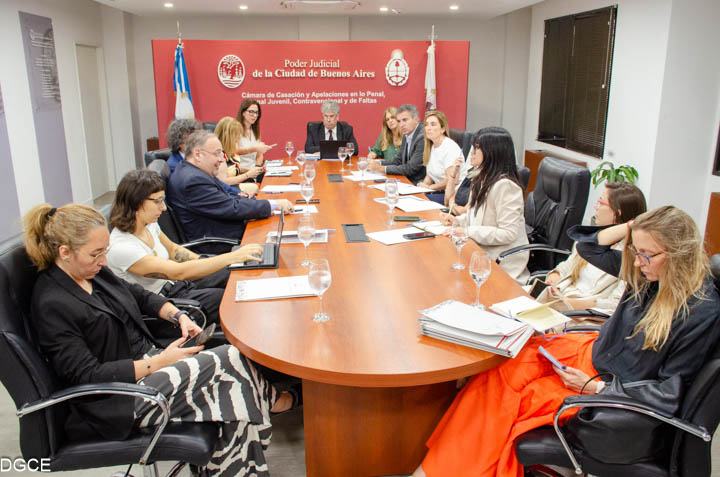 Este miércoles, en la Sala “Dra. Marta Paz” del edificio de la Cámara de Casación y Apelaciones en lo Penal, Penal Juvenil, Contravencional y de Faltas, se llevó a cabo una nueva reunión del encuentro permanente con magistrados coordinadores. La misma contó con la participación de la presidenta del Consejo de la Magistratura porteño, Karina Leguizamón y las consejeras Gabriela Zangaro y Rocío López Di Muro y estuvo organizado por el presidente de la Cámara, Javier Buján y el vicepresidente, Gonzalo Viña.